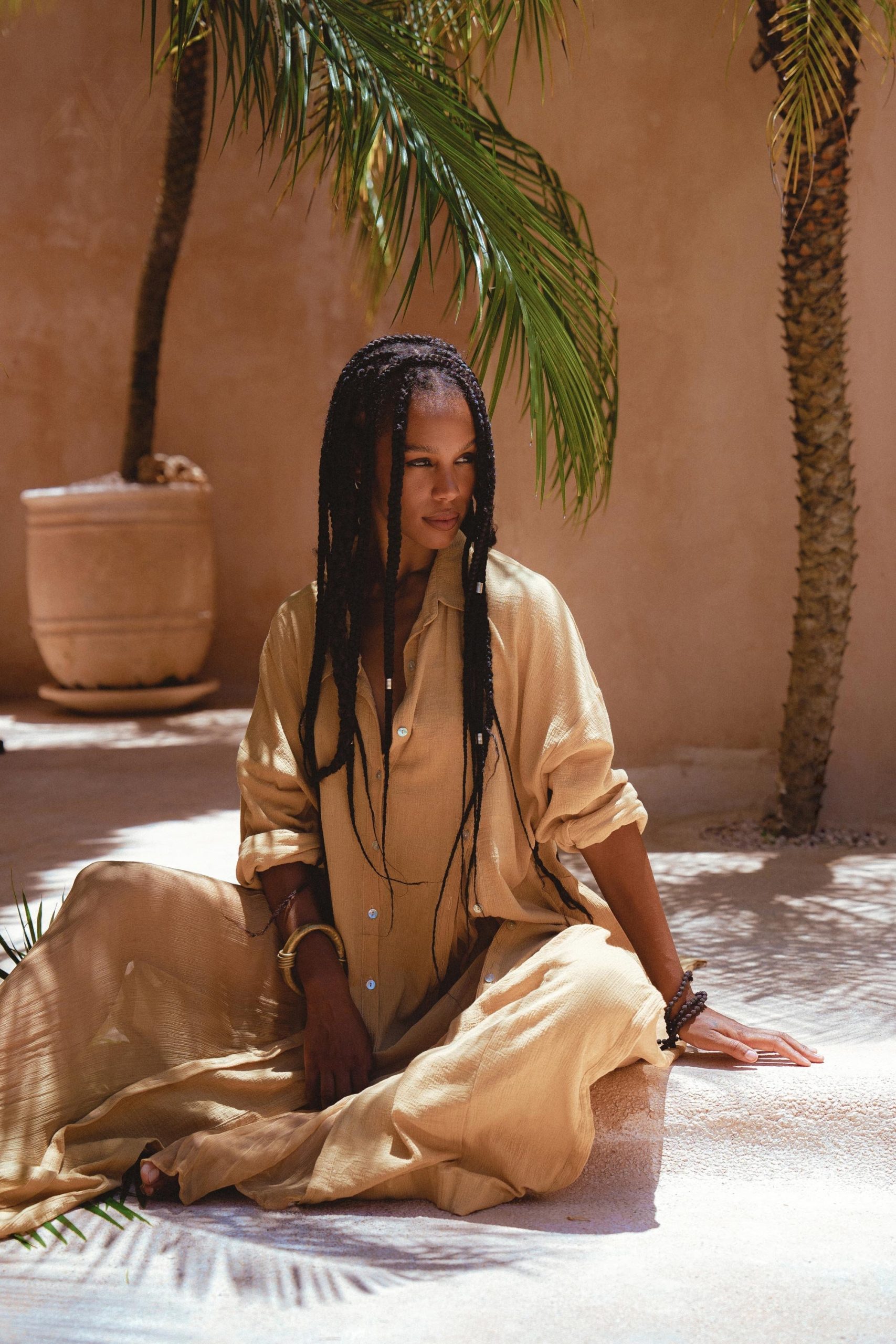 To enhance its uniqueness, our shirt dresses are dyed using organic botanical dyes. Each Tunic Blouse dress has its own special colour, and we take pride in our collaboration with the elements of nature. Additionally, these shirt dresses come with a bodysuit underneath, ensuring they are not transparent where it can’t be shown.