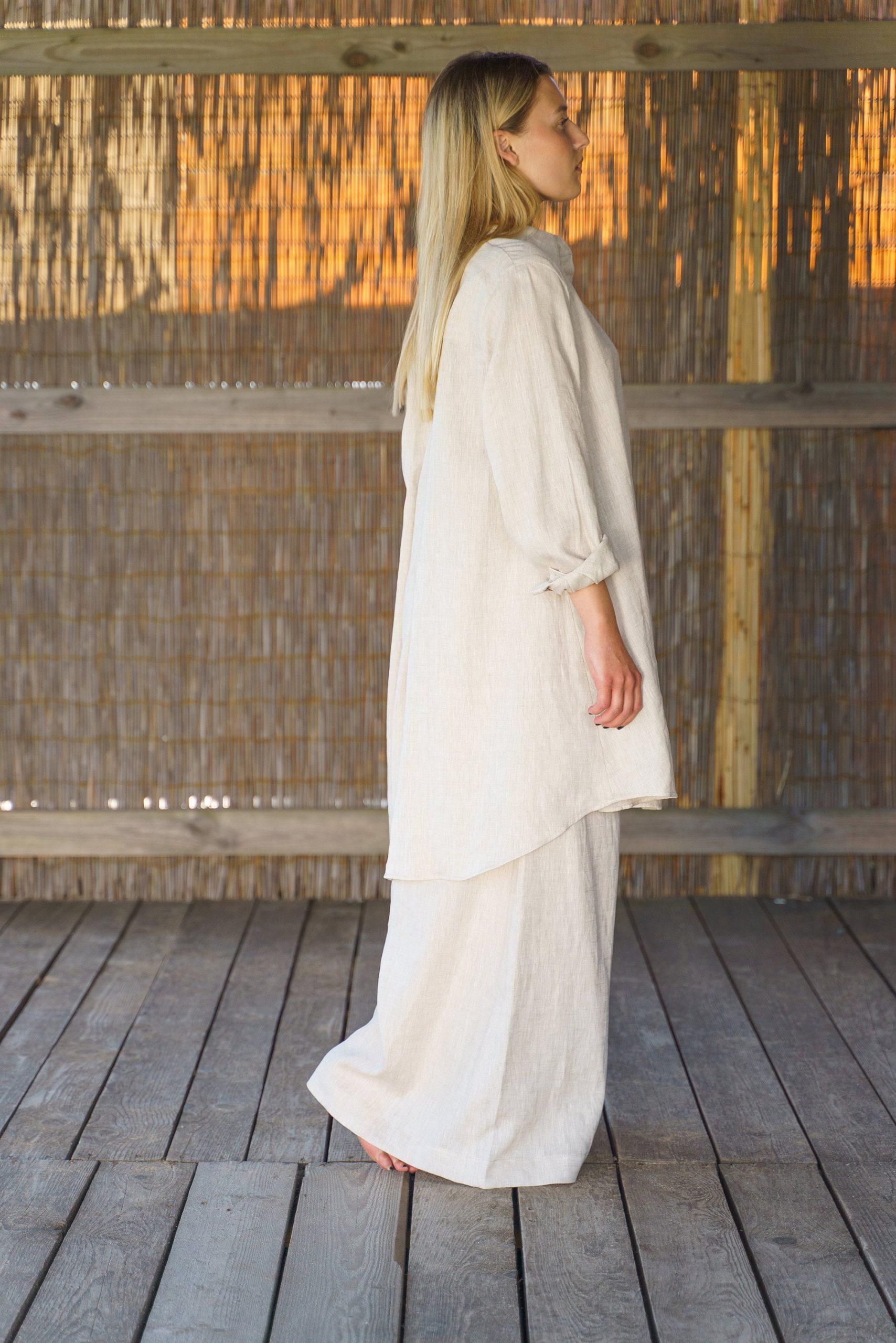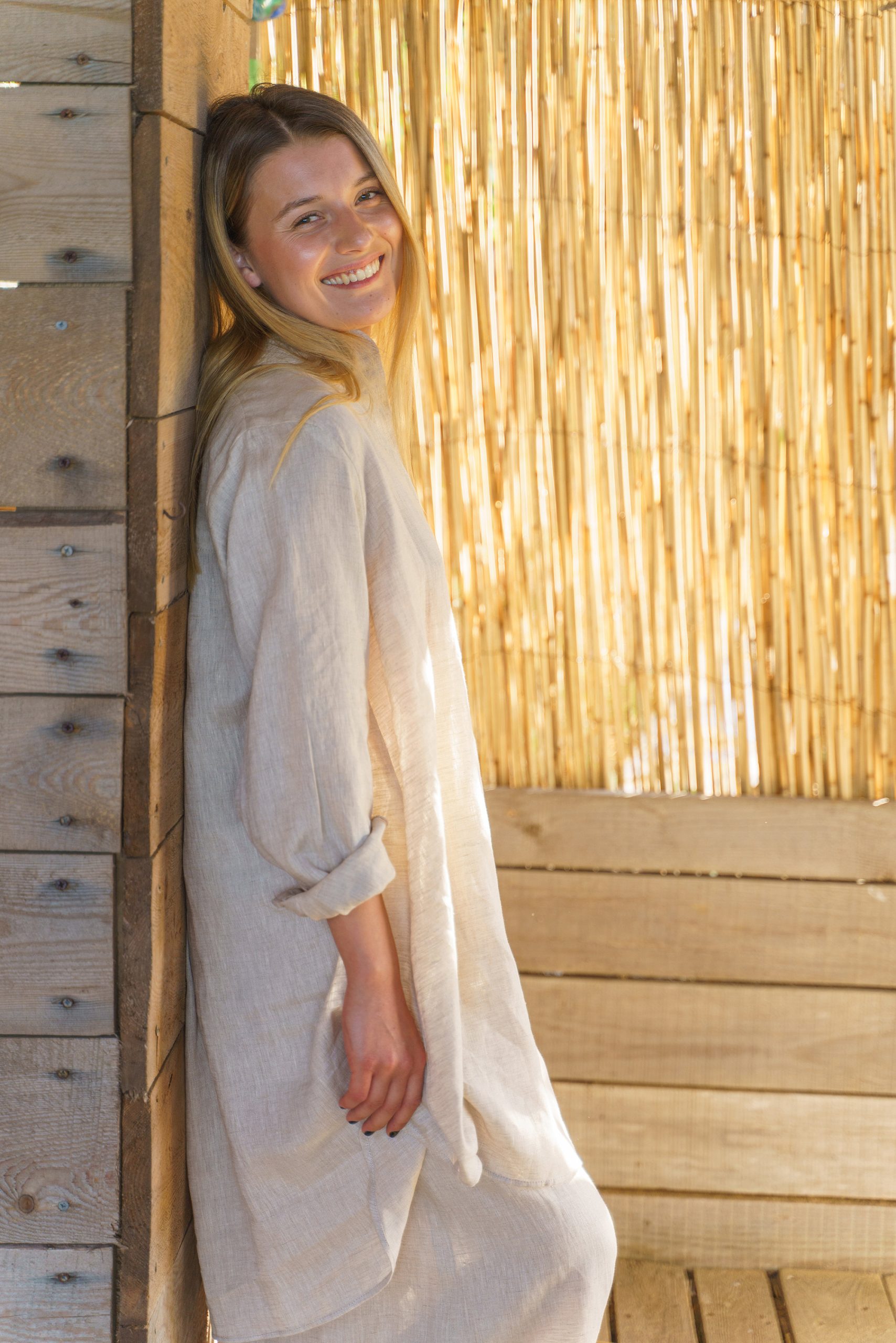 The model wears a soft beige linen shirt tunic size M.